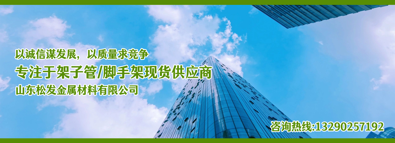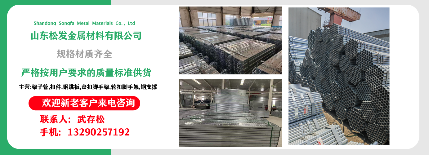 山東松發金屬材料有限公司主營架子管,扣件,鋼跳板,盤扣腳手架,輪扣腳手架,鋼支撐生產廠家。本廠專業生產銷售?! 〗ㄖ眉茏庸?、 主要用于房建,橋梁,鐵路,公路,地鐵,水庫,隧道,支撐?! 〖茏庸?扣件,鋼跳板,盤扣腳手架,輪扣腳手架,鋼支撐的優越性及應用“ ”產品因具有結構簡單合理、設計巧妙、使用方便、安全、快捷、易于運輸、儲存、維護簡單等特點?! 」疽回瀳猿帧百|量,用戶至上,優質服務,信守合同”的宗旨,憑借著高質量的產品,良好的信譽,優質的服務,產品暢銷全球。歡迎廣大客戶來電洽談,共同發展,共創輝煌!  山東松發金屬材料有限公司秉承誠信服務、恪守信譽的宗旨,在同等的質量下,保證以最低的價格,最完善的服務,最高的信譽來答謝各界朋友的支持和厚愛,歡迎您的來電、咨詢,我們將竭誠為您服務!...